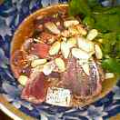 ロ.刺身用の鰹をイに漬け込んで、大葉を敷いた皿に盛り、松の実を散らす